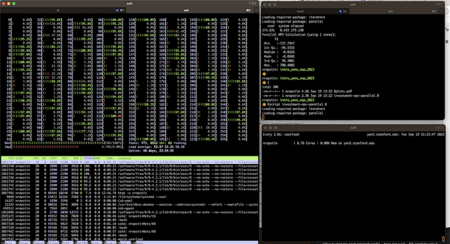 Once you have three terminal windows connected to the same yen, run the investment-npv-serial.R program after loading the R module in one of the terminals: